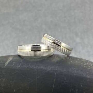 Alianzas de plata 925 y oro sintetizado 585 con relieve, 5.5 mm de ancho. Diseño elegante y con carácter, hechas para acompañaros toda la vida.