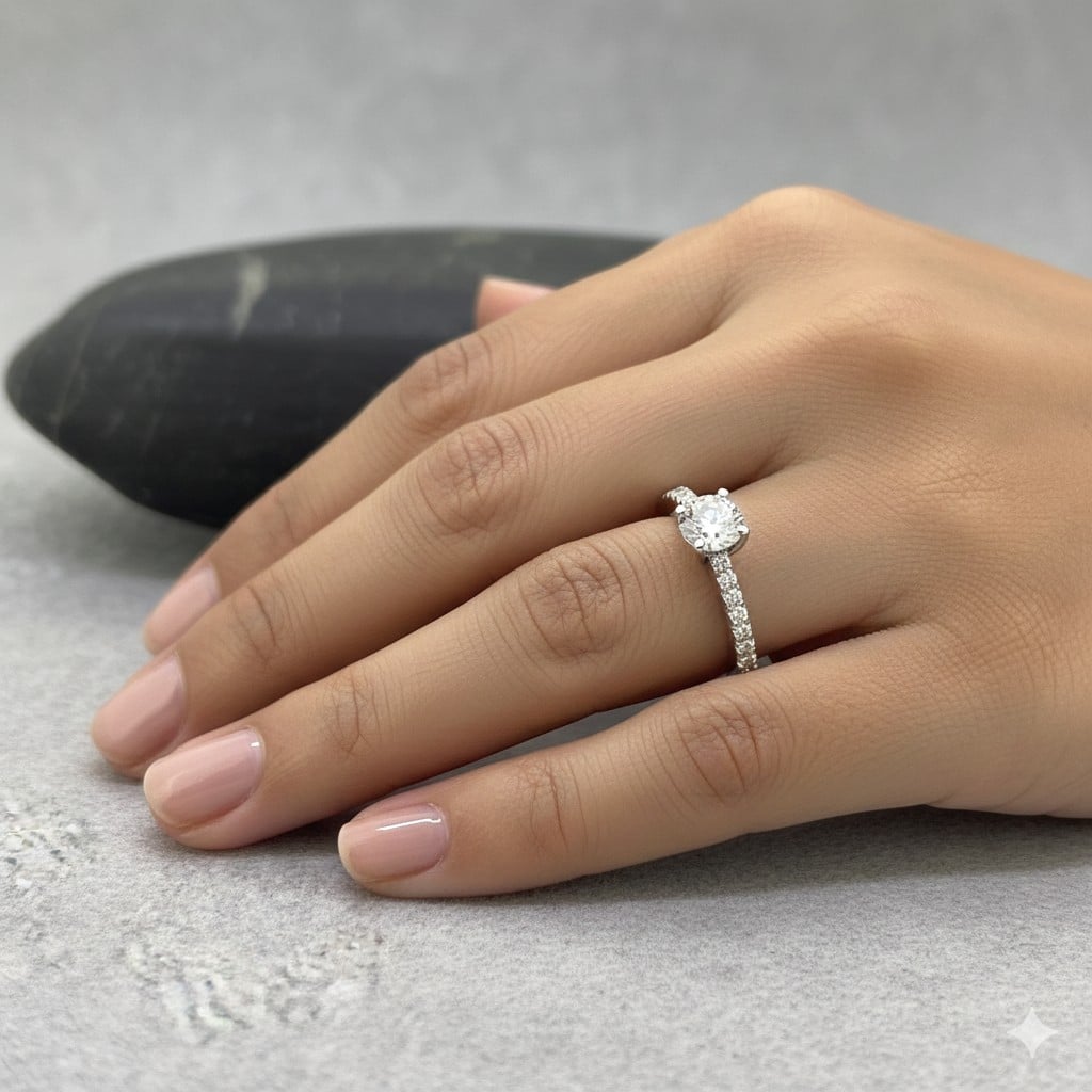 En su centro brilla un diamante talla brillante de 0.30 quilates, color E, pureza VS1, certificado por el prestigioso laboratorio GIA, símbolo de excelencia y garantía de calidad internacional. Su belleza se realza con un delicado engaste de diamantes adicionales en el brazo superior, aportando destellos que iluminan cada gesto de quien lo lleva.