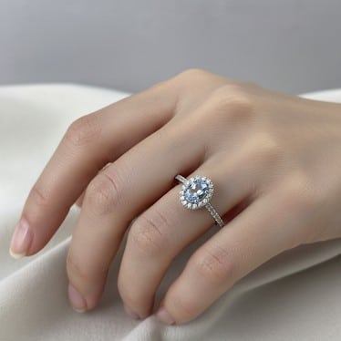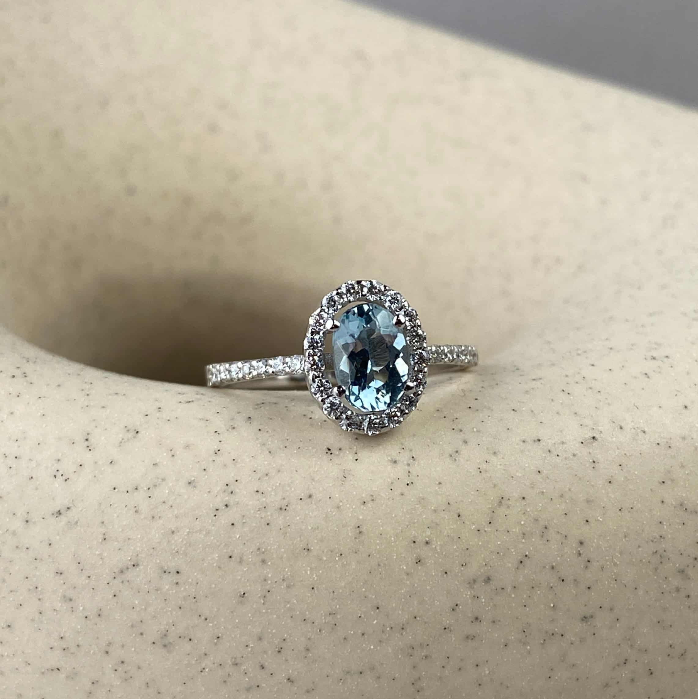 Anillo de oro blanco de 18 kilates con aguamarina oval y diamantes blancos naturales.