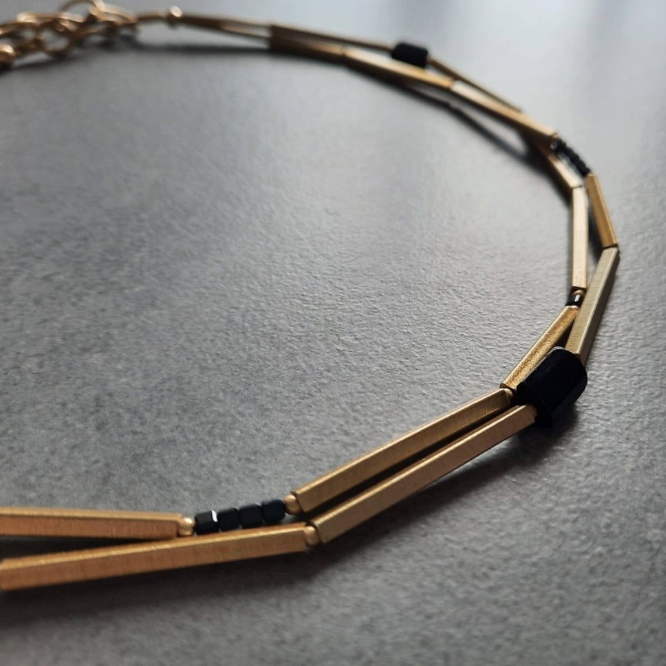 Collar de plata hecho de manera artesanal con plata chapada en oro y turmalinas negras.