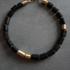 Su diseño sobrio y minimalista, que combina la Plata de Ley con un exquisito baño de oro, se realza con la fuerza de las turmalinas negras naturales en formato semi bruto.