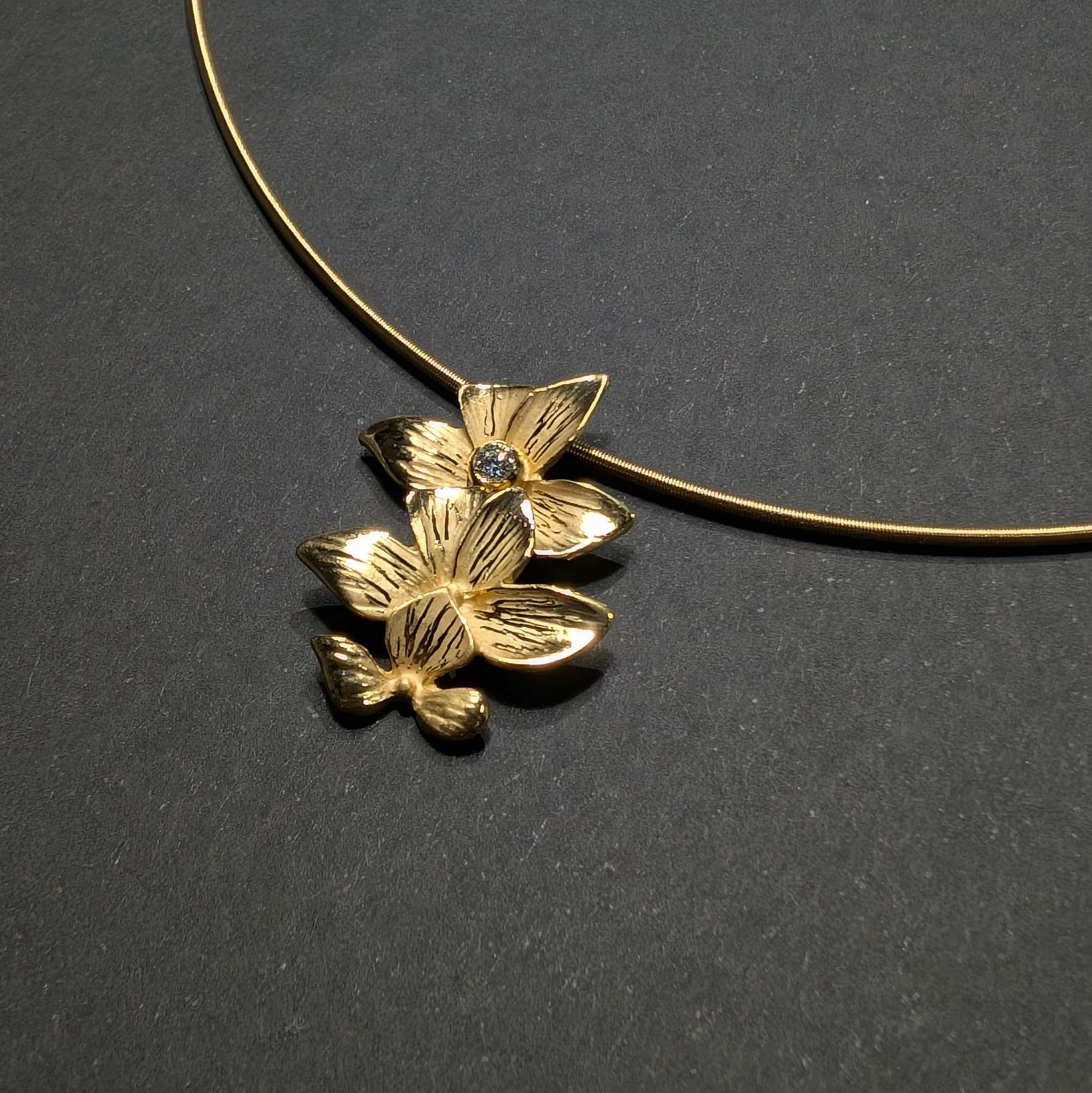 Diseñado para ser el centro de todas las miradas, este collar es la evolución contemporánea de la joyería floral. El colgante replica la estructura de los pendientes de la colección, con dos capas de pétalos ondulados que crean un volumen orgánico y sofisticado.