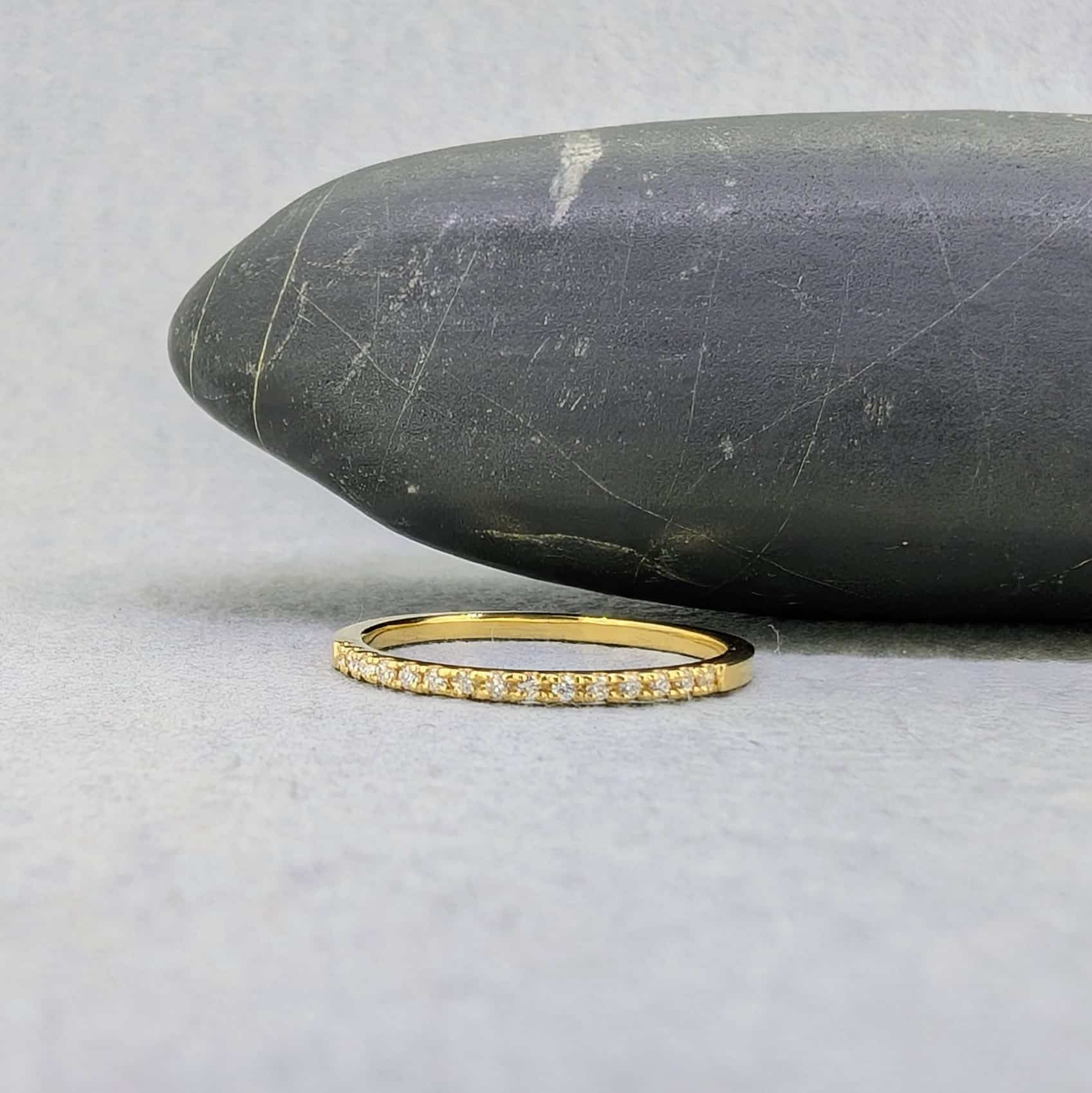 La delicadeza convertida en joya. Esta media alianza de estilo minimalista ha sido creada en oro amarillo de 18 quilates, engastada a mano con 15 diamantes talla brillante de calidad superior (FVS). Con un diseño fino de 1 mm, es la pieza perfecta para quienes buscan un brillo sutil, elegante y eterno.