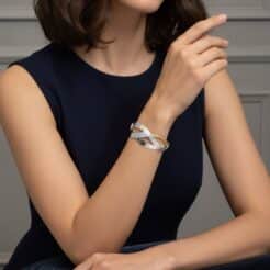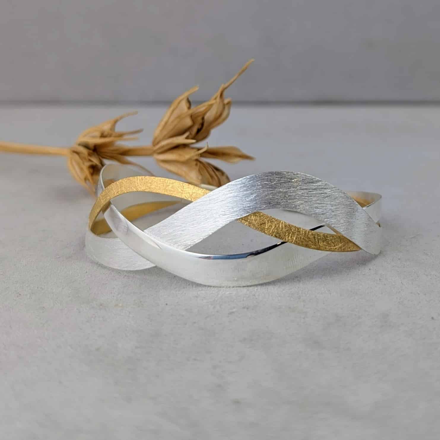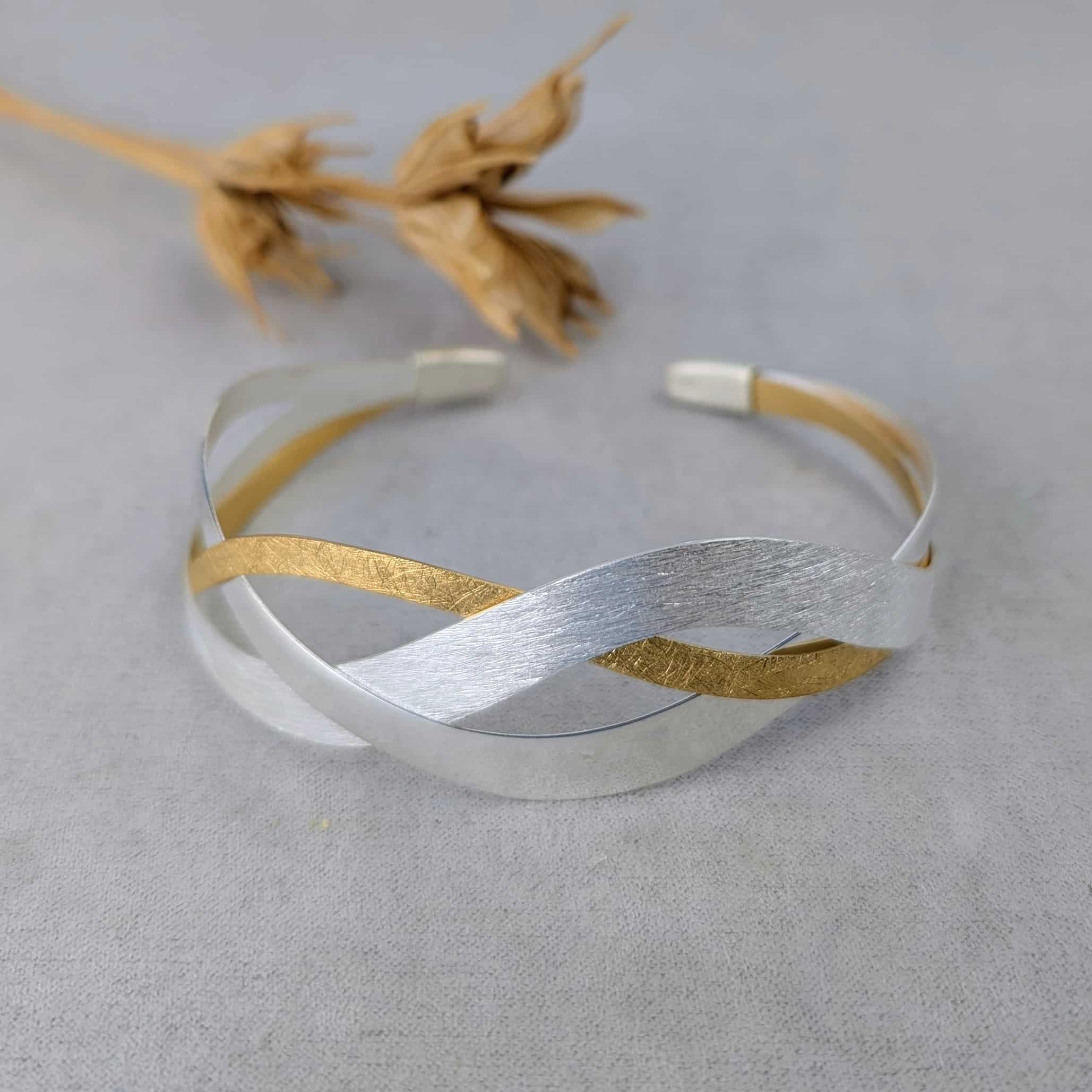 Pulsera de plata de diseño vanguardista en tres acabados diferentes.