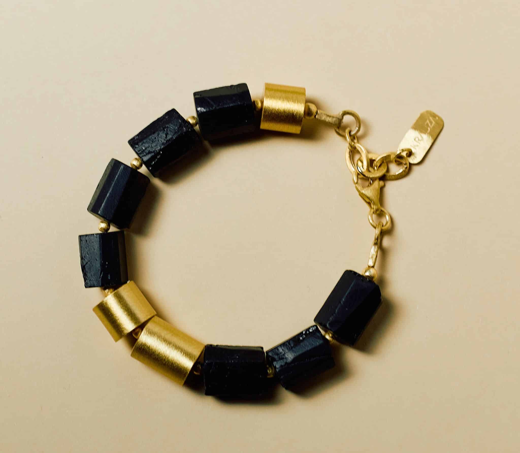 Su diseño sobrio y minimalista, que combina la Plata de Ley con un exquisito baño de oro, se realza con la fuerza de las turmalinas negras naturales en formato semi bruto.