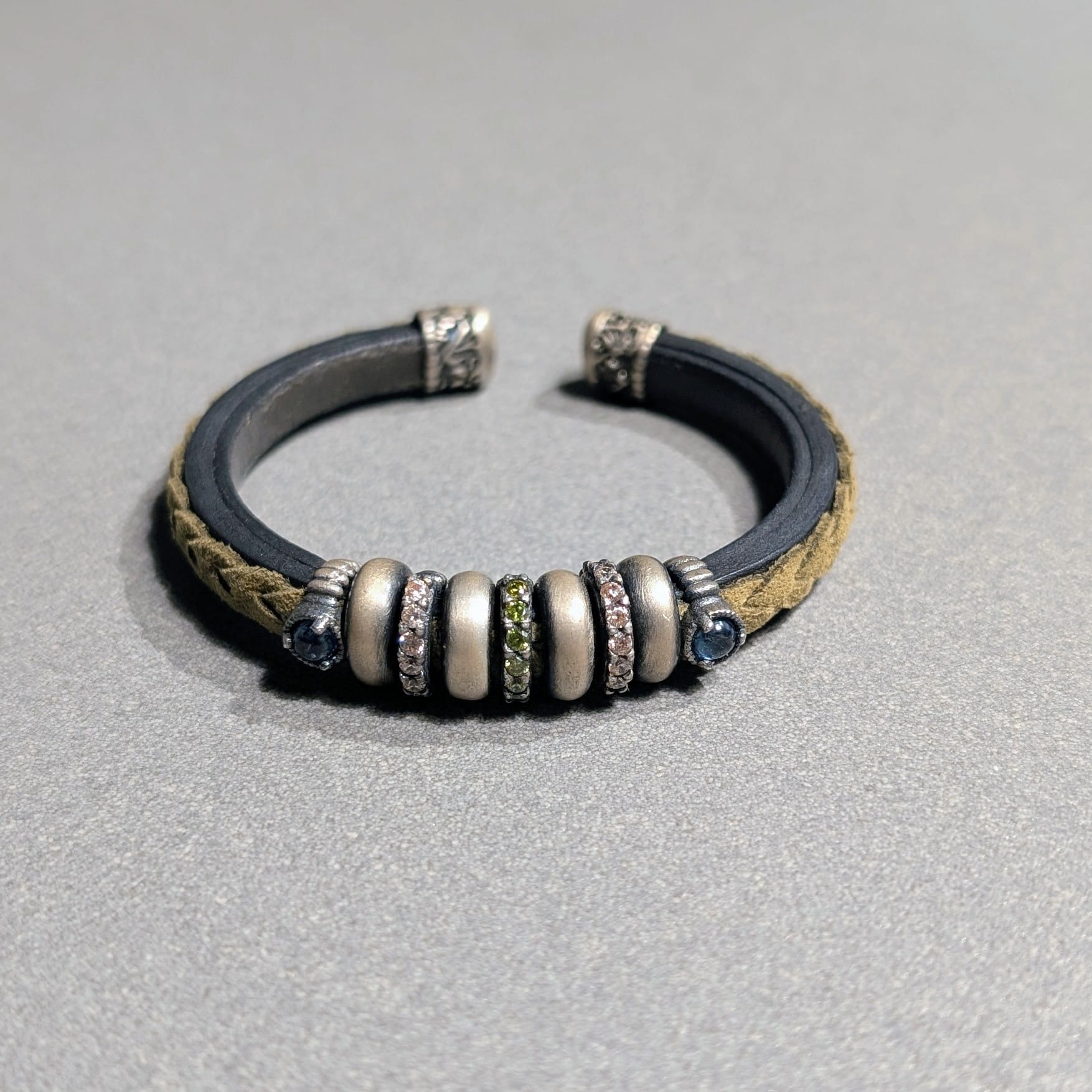 Pulsera de plata y cuero de la marca Raive con piezas originales con circonitas.